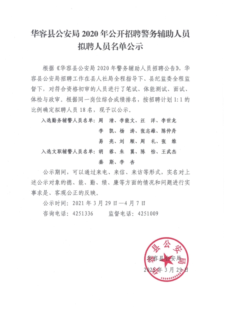 华容县公安局2020年公开招聘警务辅助人员拟聘人员名单公示