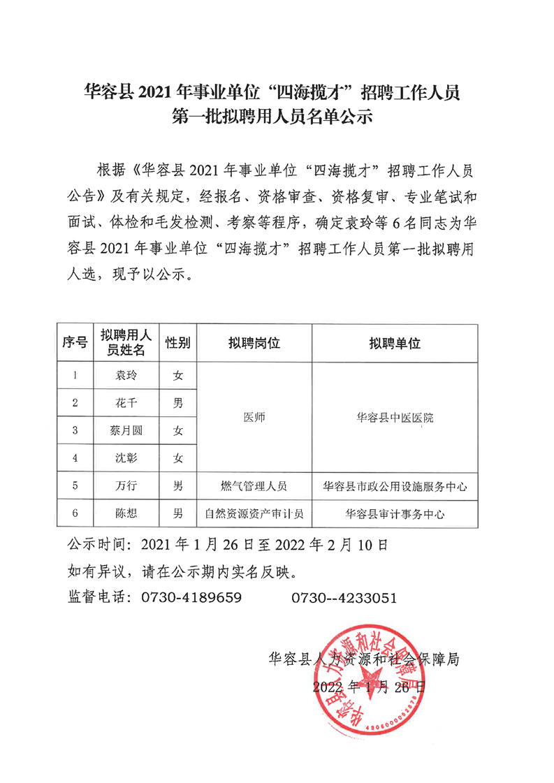 华容县2021年事业单位“四海揽才”招聘工作人员第一批拟聘用人员名单公示