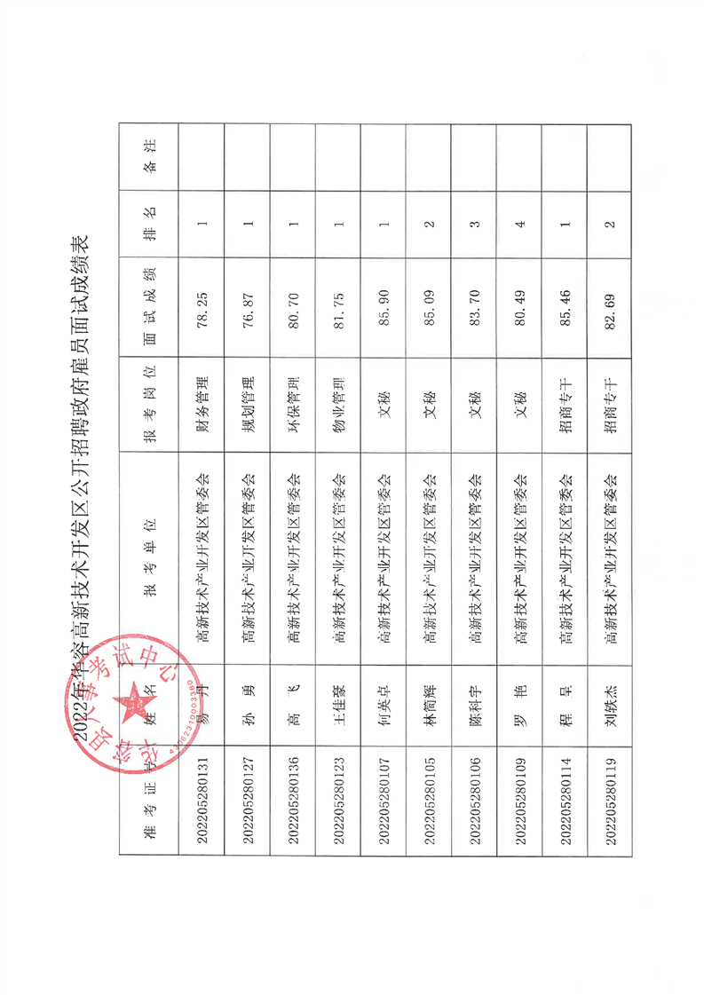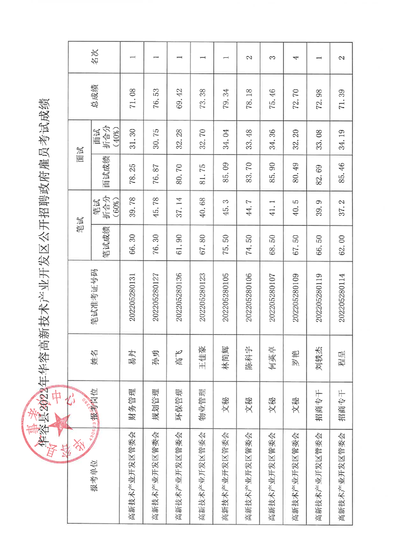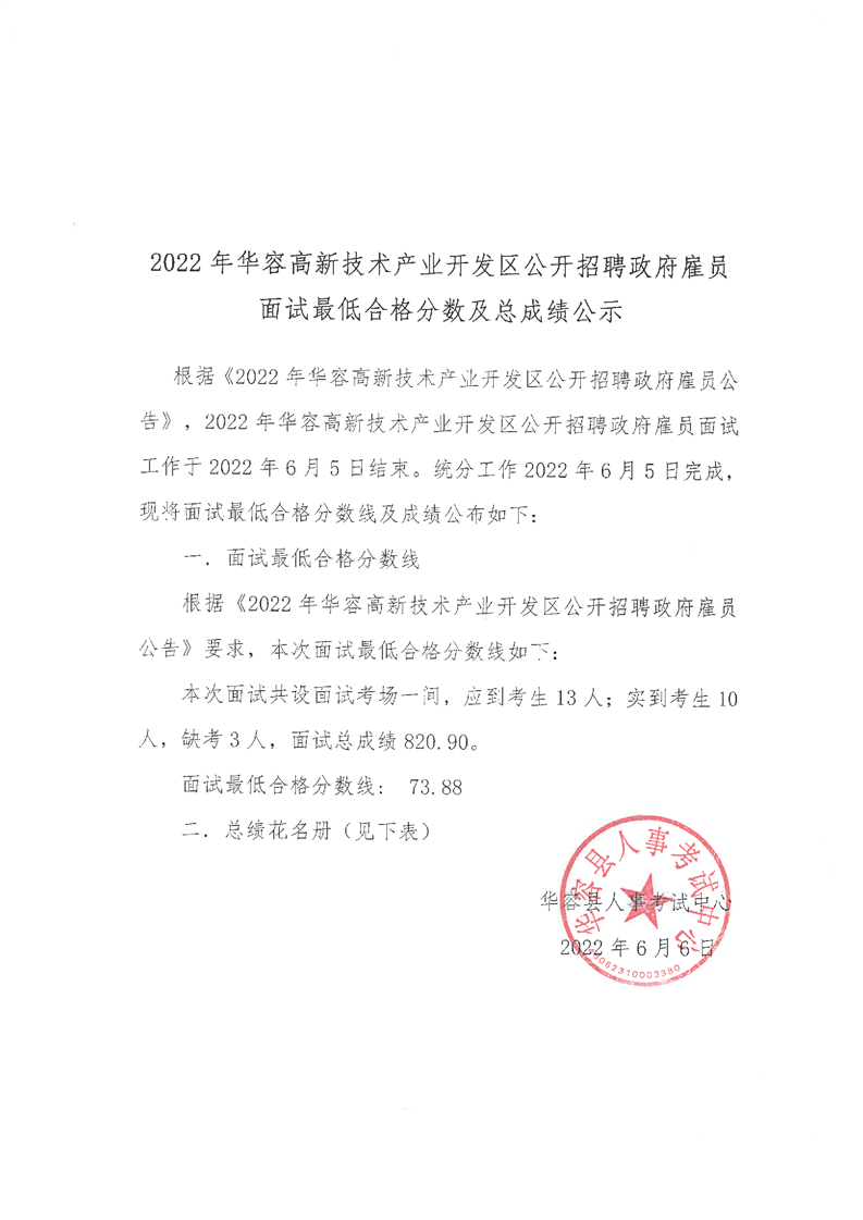 2022年华容高新技术产业开发区公开招聘政府雇员面试最低合格分数及总成绩公示