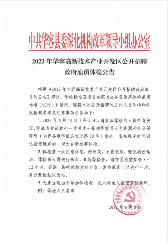 2022年华容高新技术产业开发区公开招聘政府雇员体检公告