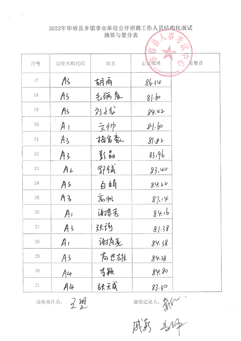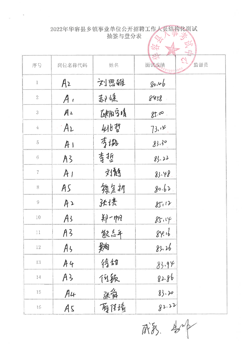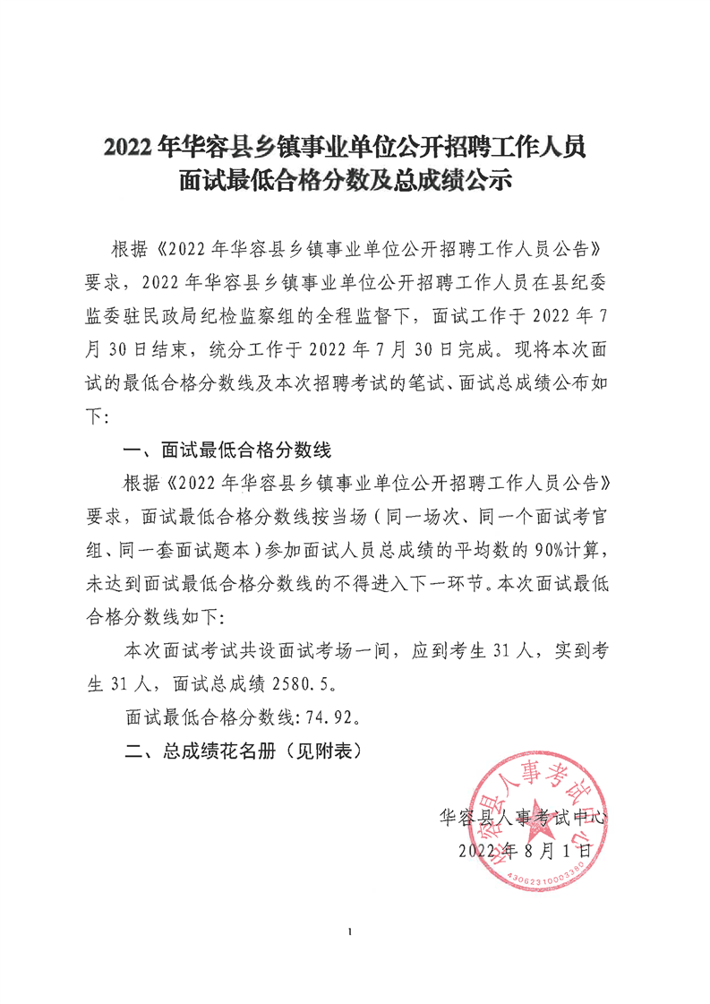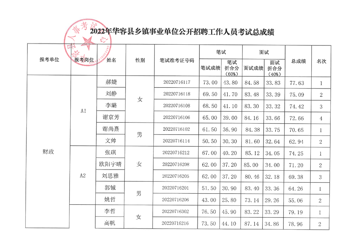 2022年华容县乡镇事业单位公开招聘工作人员面试最低合格分数及总成绩公示