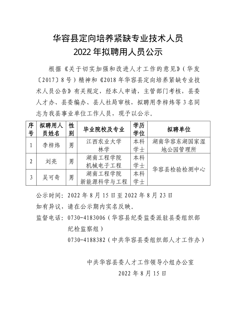 华容县定向培养紧缺专业技术人员2022年拟聘用人员公示