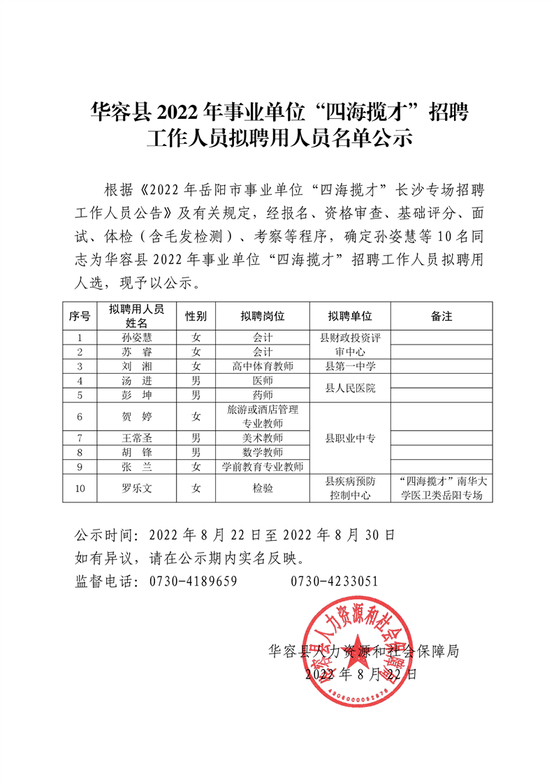 2022年华容县事业单位“四海揽才”招聘工作人员拟聘用人员名单公示