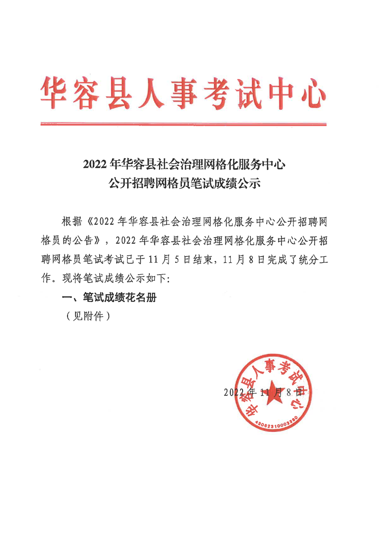2022年华容县社会治理网格化服务中心公开招聘网格员笔试成绩公示