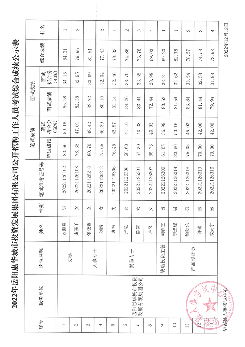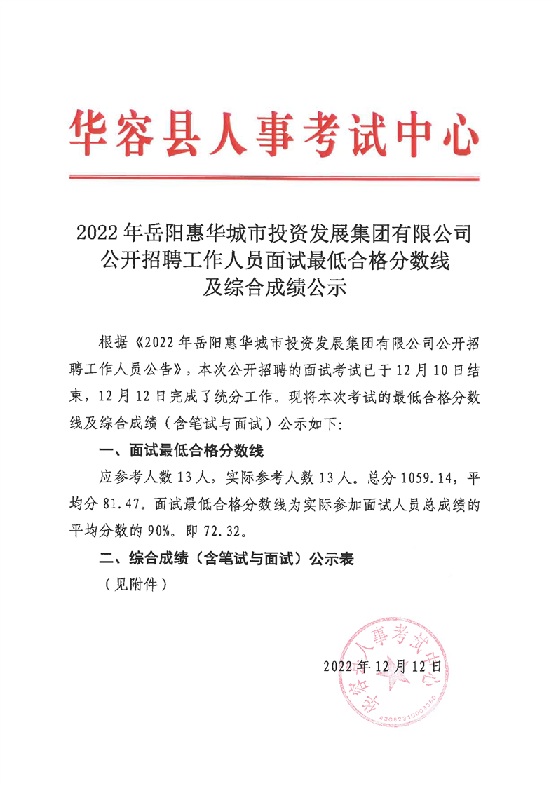 2022年岳阳惠华城市投资发展集团有限公司公开招聘工作人员面试最低合格分数线及综合成绩公示