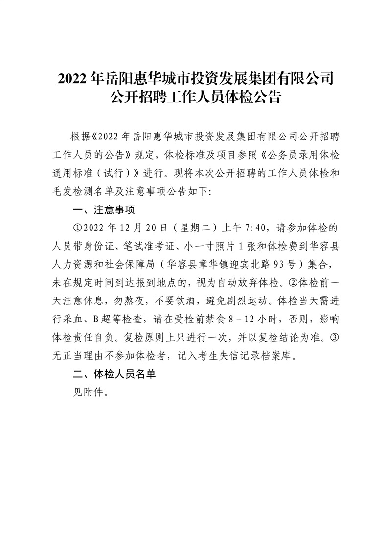 2022年岳阳惠华城市投资发展集团有限公司公开招聘工作人员体检公告