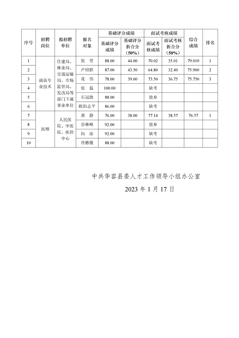 2022年华容县事业单位第二批“四海揽才”招聘高层次专业化人才(副高专业技术人员、医师)综合成绩公示