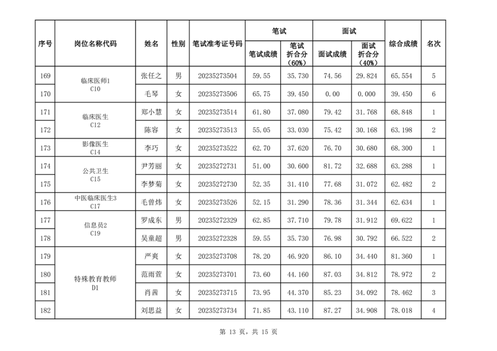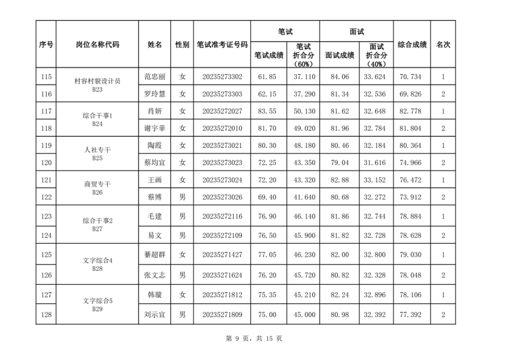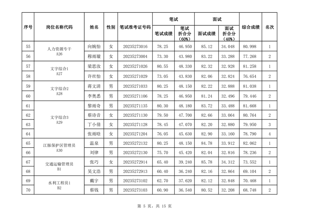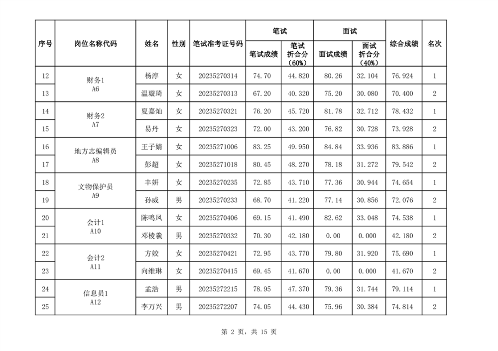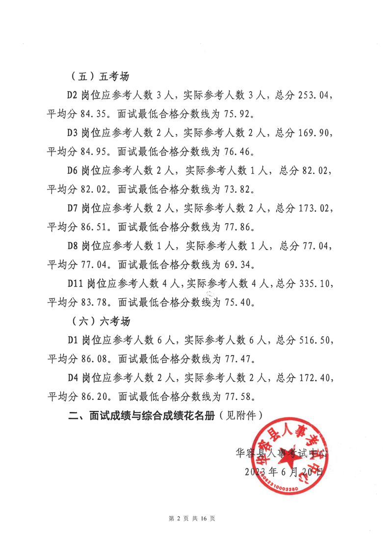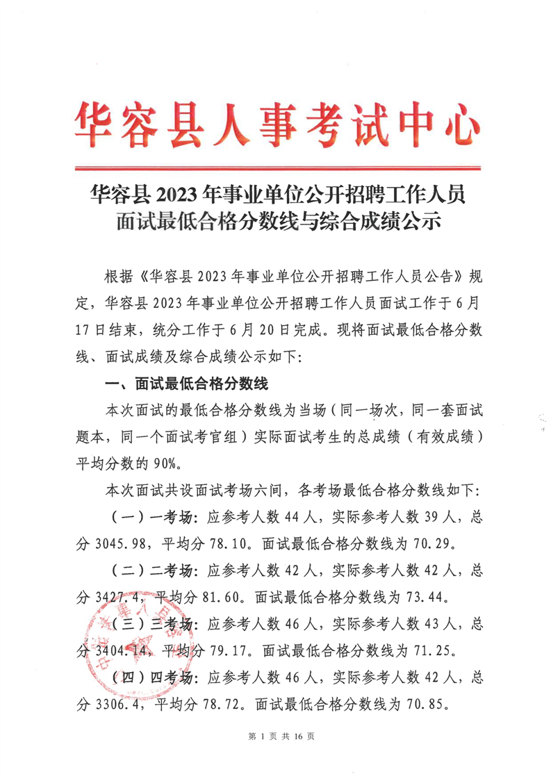 华容县2023年事业单位公开招聘工作人员面试最低合格分数线与综合成绩公示