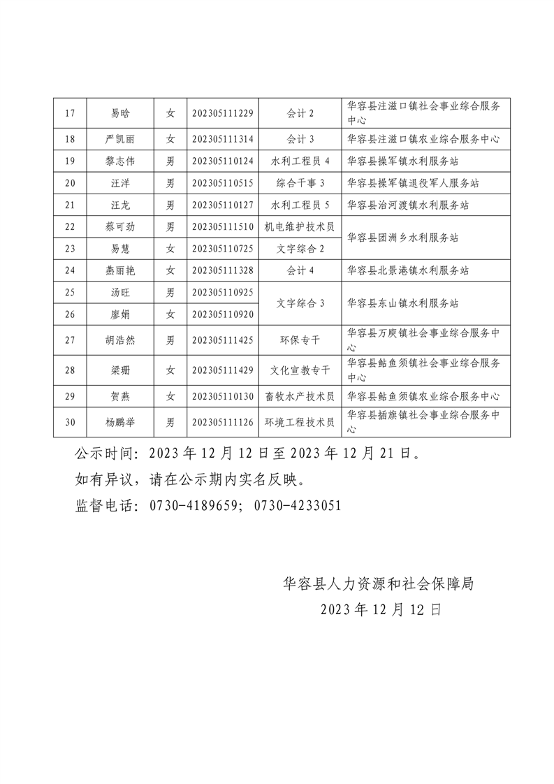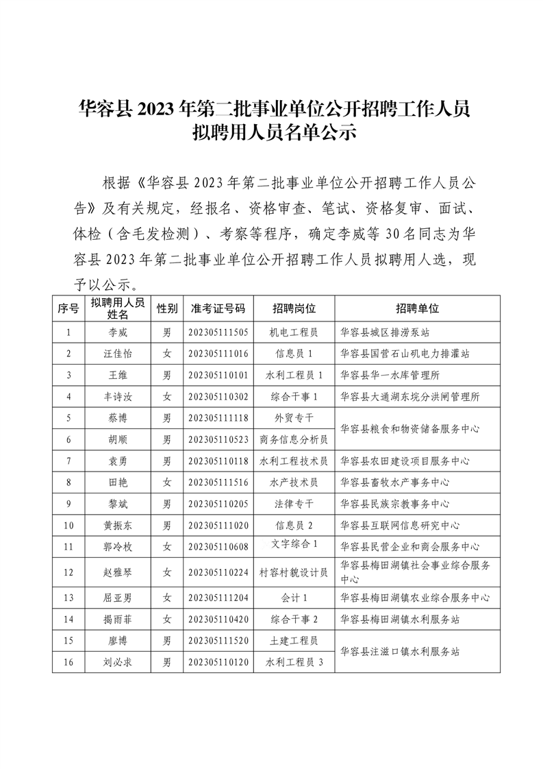 华容县2023年第二批事业单位公开招聘工作人员拟聘用人员名单公示