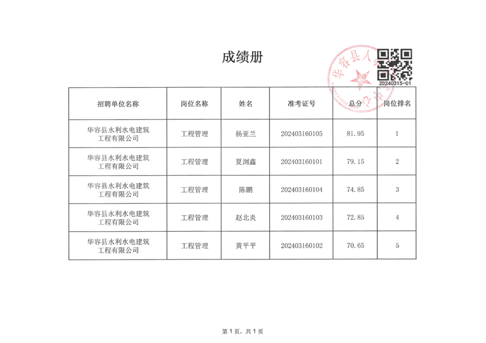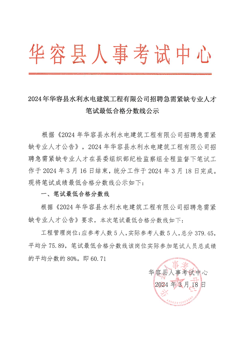 2024年华容县水利水电建筑工程有限公司招聘急需紧缺专业人才笔试最低合格分数线公示
