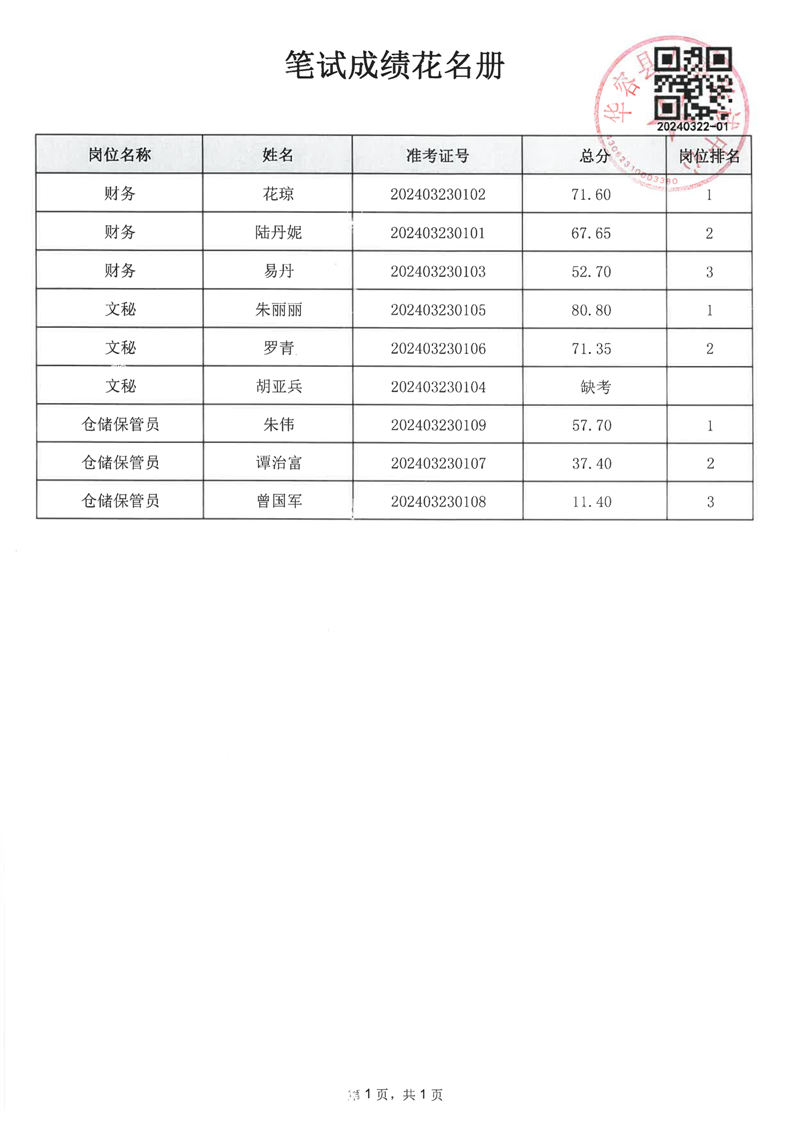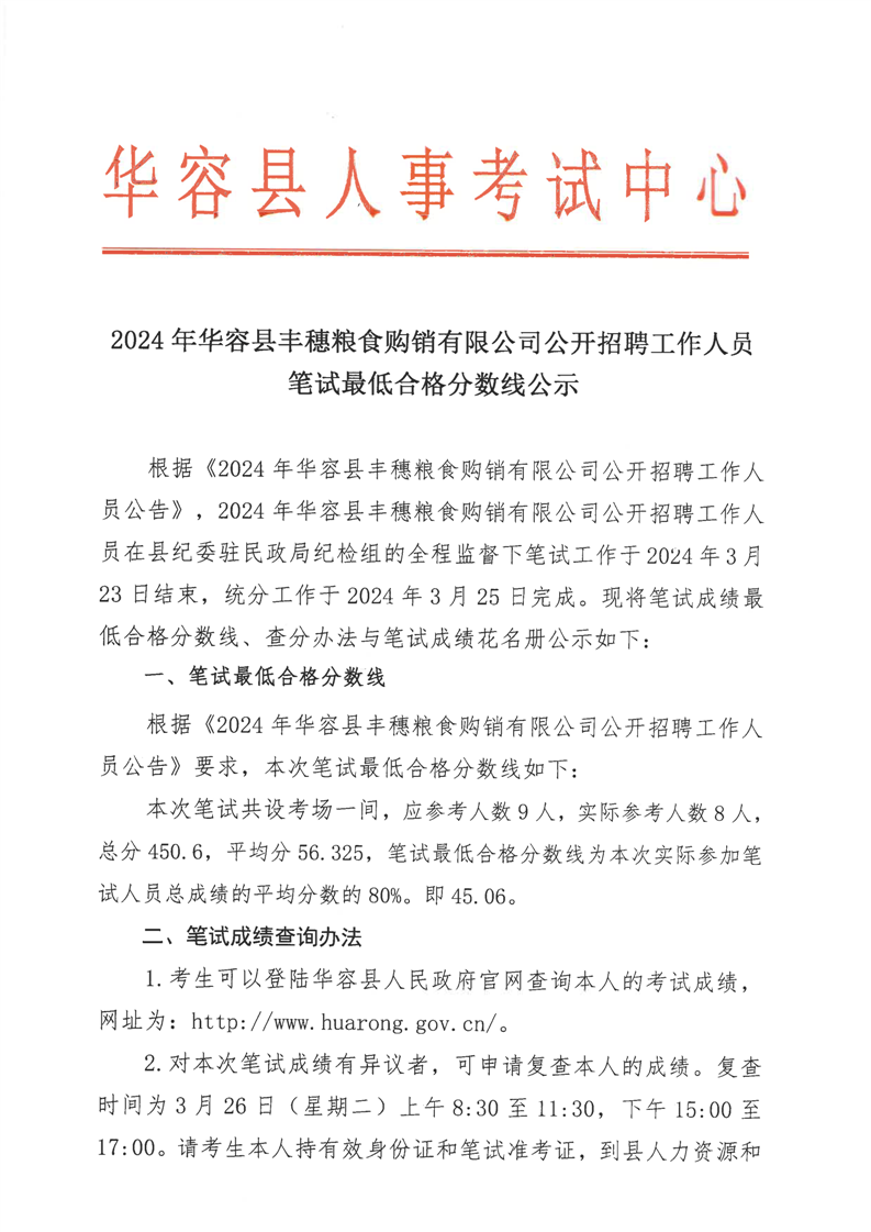 2024年华容县丰穗粮食购销有限公司公开招聘工作人员笔试最低合格分数线公示