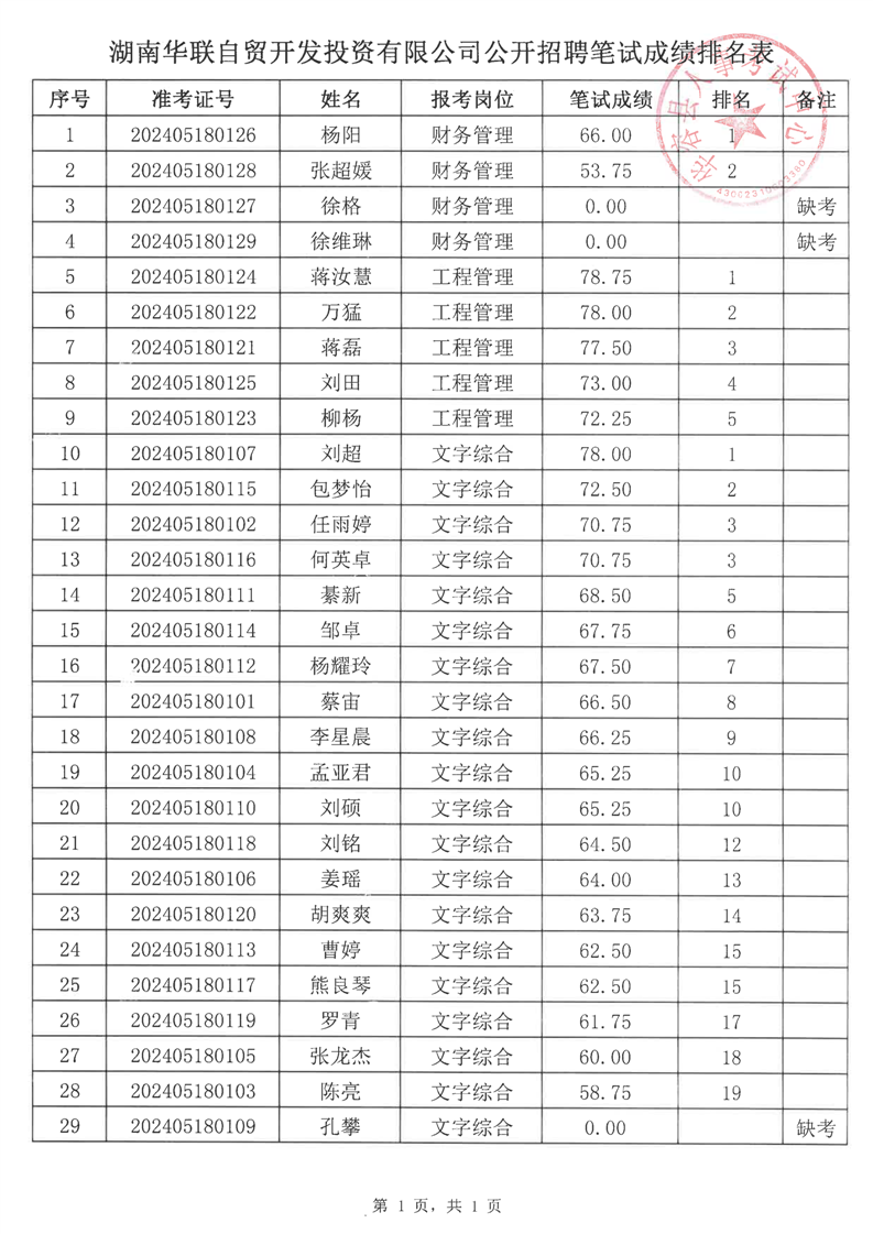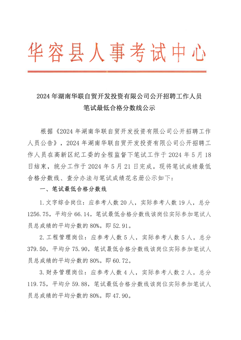 2024年湖南华联自贸开发投资有限公司公开招聘工作人员笔试最低合格分数线公示