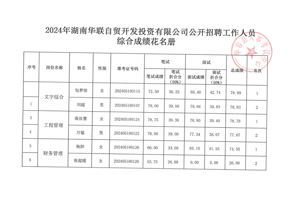 2024年湖南华联自贸开发投资有限公司公开招聘工作人员面试成绩最低合格分数线及综合成绩公示