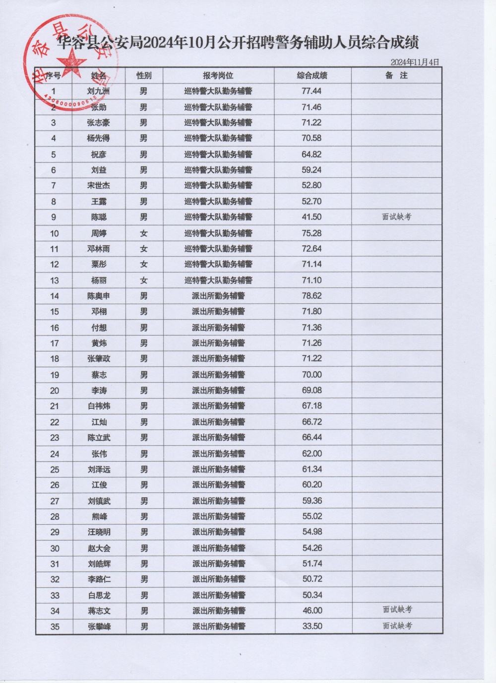 华容县公安局2024年10月公开招聘警务辅助人员综合成绩公示