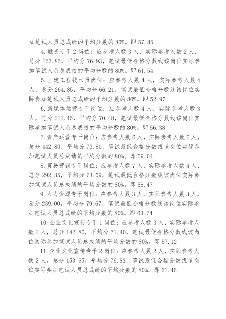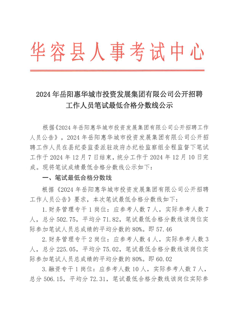 2024年岳阳惠华城市投资发展集团有限公司公开招聘工作人员笔试最低合格分数线公示