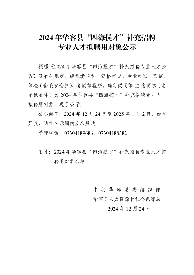 2024年华容县“四海揽才”补充招聘专业人才拟聘用对象公示