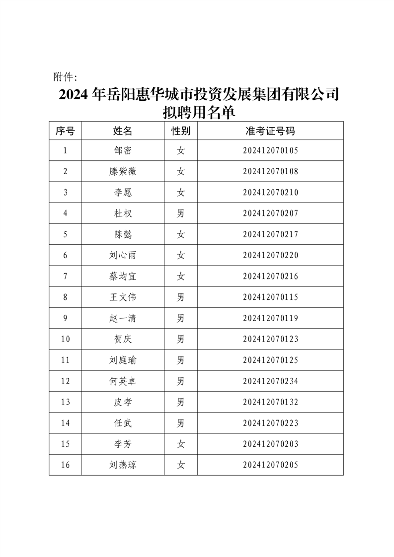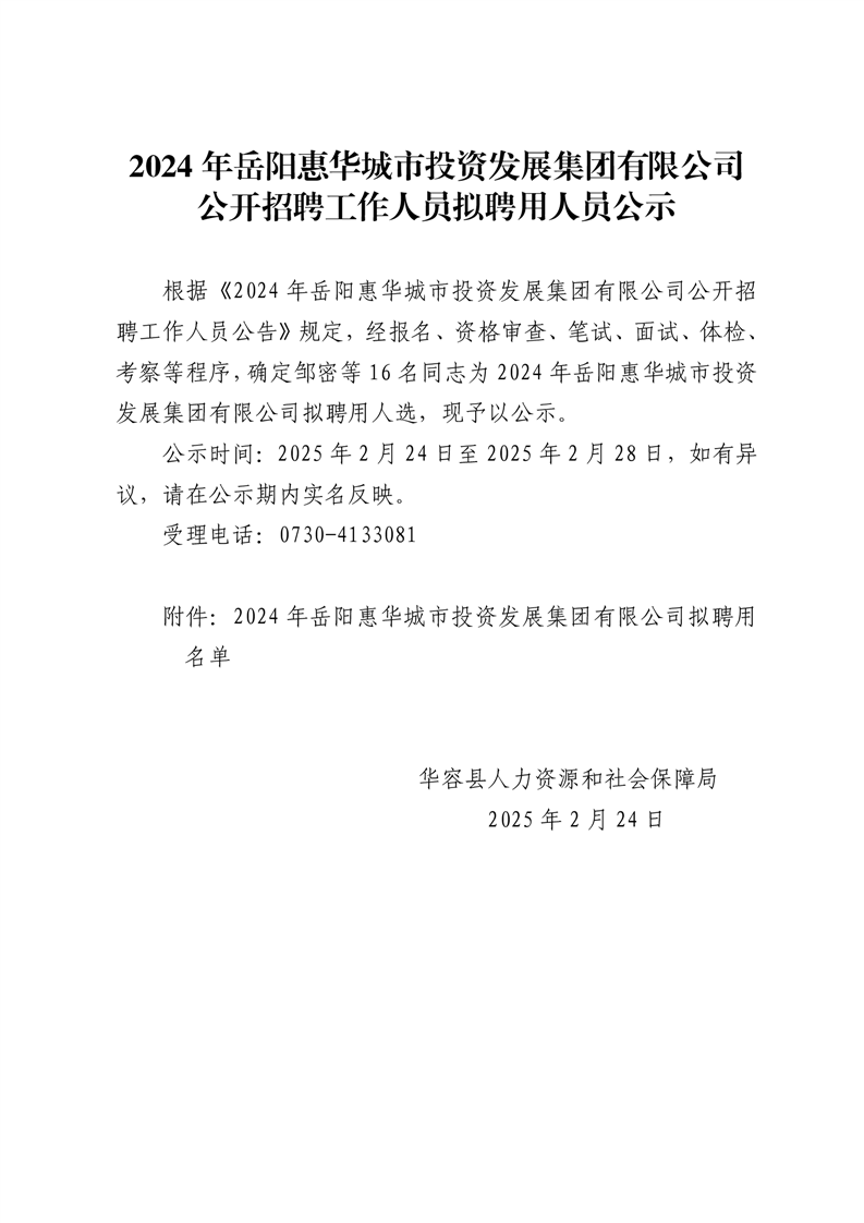 2024年岳阳惠华城市投资发展集团有限公司公开招聘工作人员拟聘用人员公示