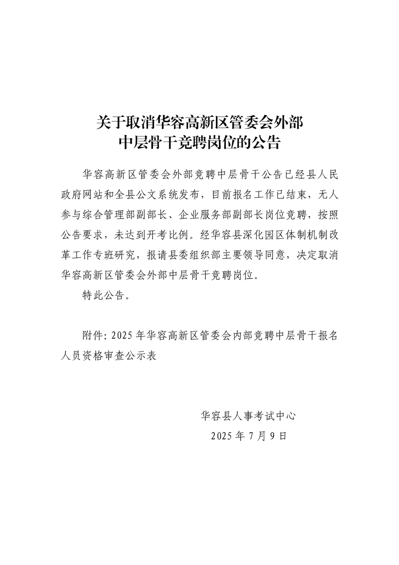 关于取消华容高新区管委会外部中层骨干竞聘岗位的公告