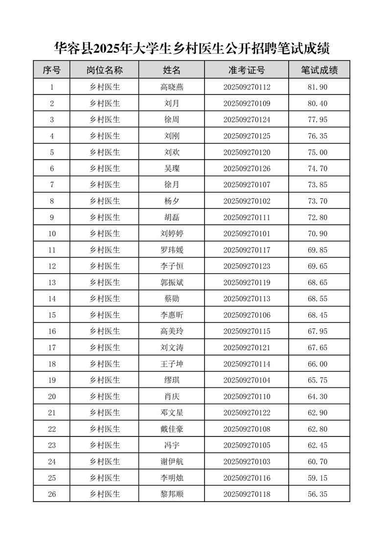 华容县2025年大学生乡村医生公开招聘笔试成绩公示