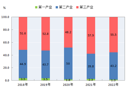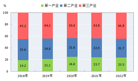 图2 2018-2022年三次产业增加值占地区生产总值比重