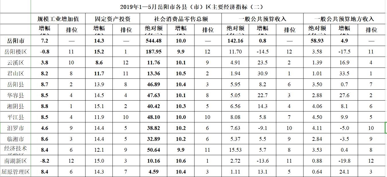 2019年1—5月岳阳市各县(市)区主要经济指标