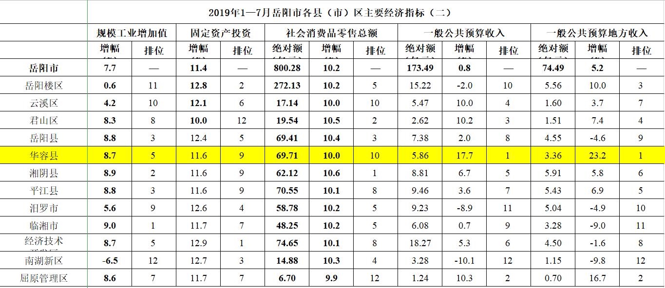 2019年1—7月岳阳市各县(市)区主要经济指标
