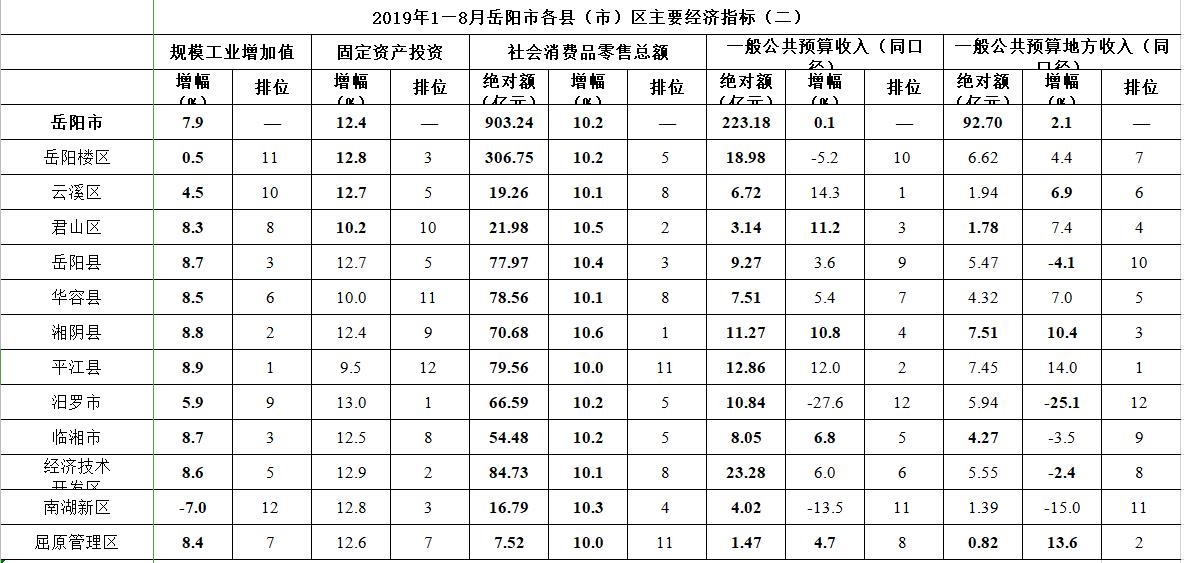 2019年1—8月岳阳市各县(市)区主要经济指标