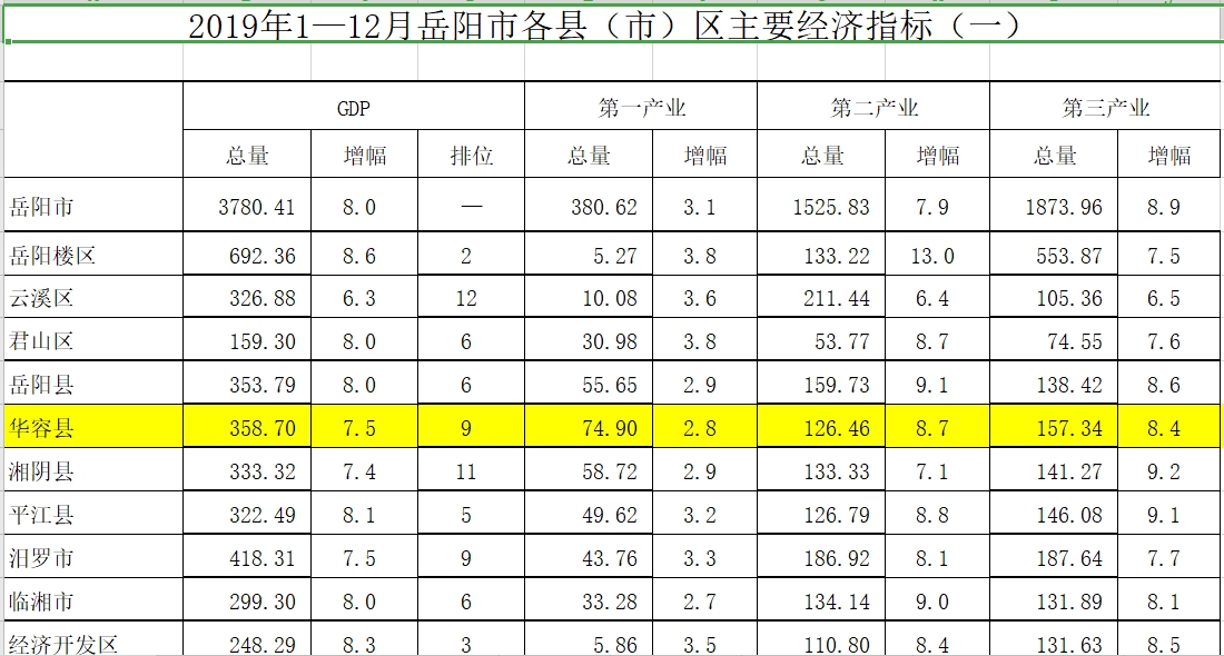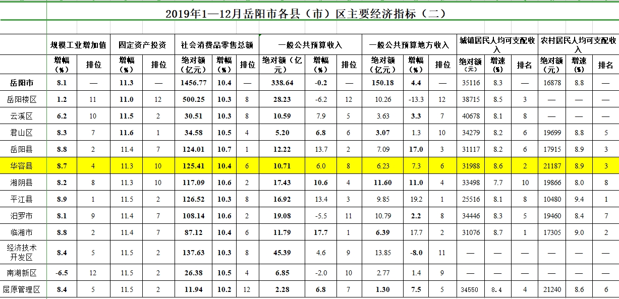 2019年1—12月岳阳市各县(市)区主要经济指标