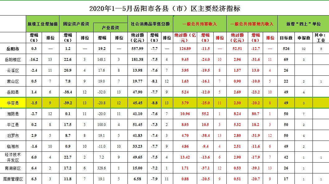 2020年1—5月岳阳市各县(市)区主要经济指标