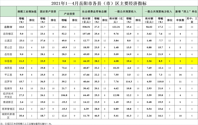 2021年1—4月岳阳市各县(市)区主要经济指标