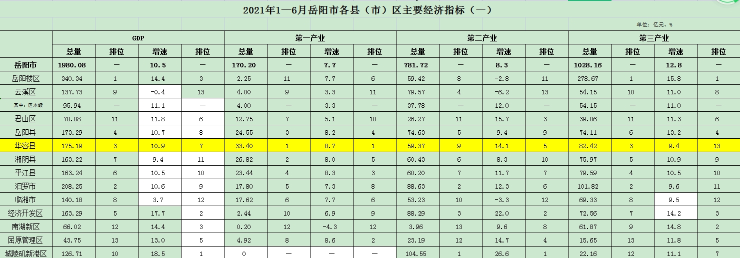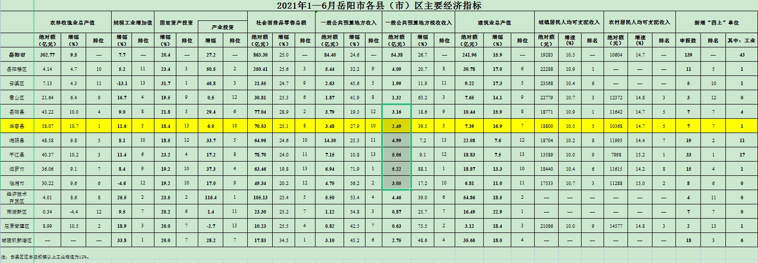 2021年1—6月岳阳市各县(市)区主要经济指标