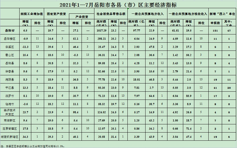2021年1—7月岳阳市各县(市)区主要经济指标