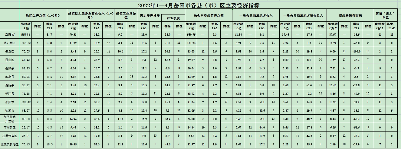 2022年1—4月岳阳市各县(市)区主要经济指标
