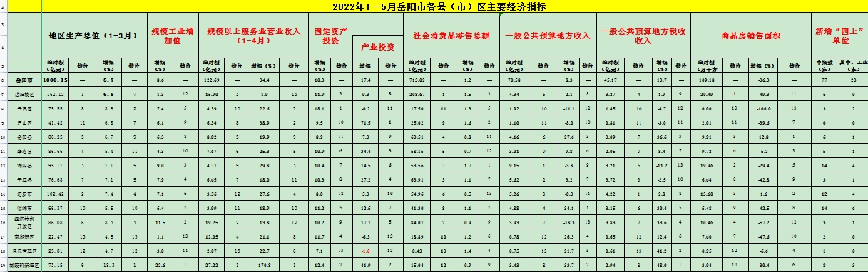 2022年1—5月岳阳市各县(市)区主要经济指标