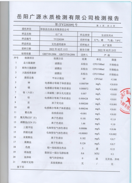 2022年2月水质检测报告(出厂水) (图)