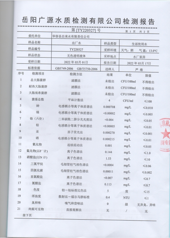2022年3月水质检测报告(出厂水)