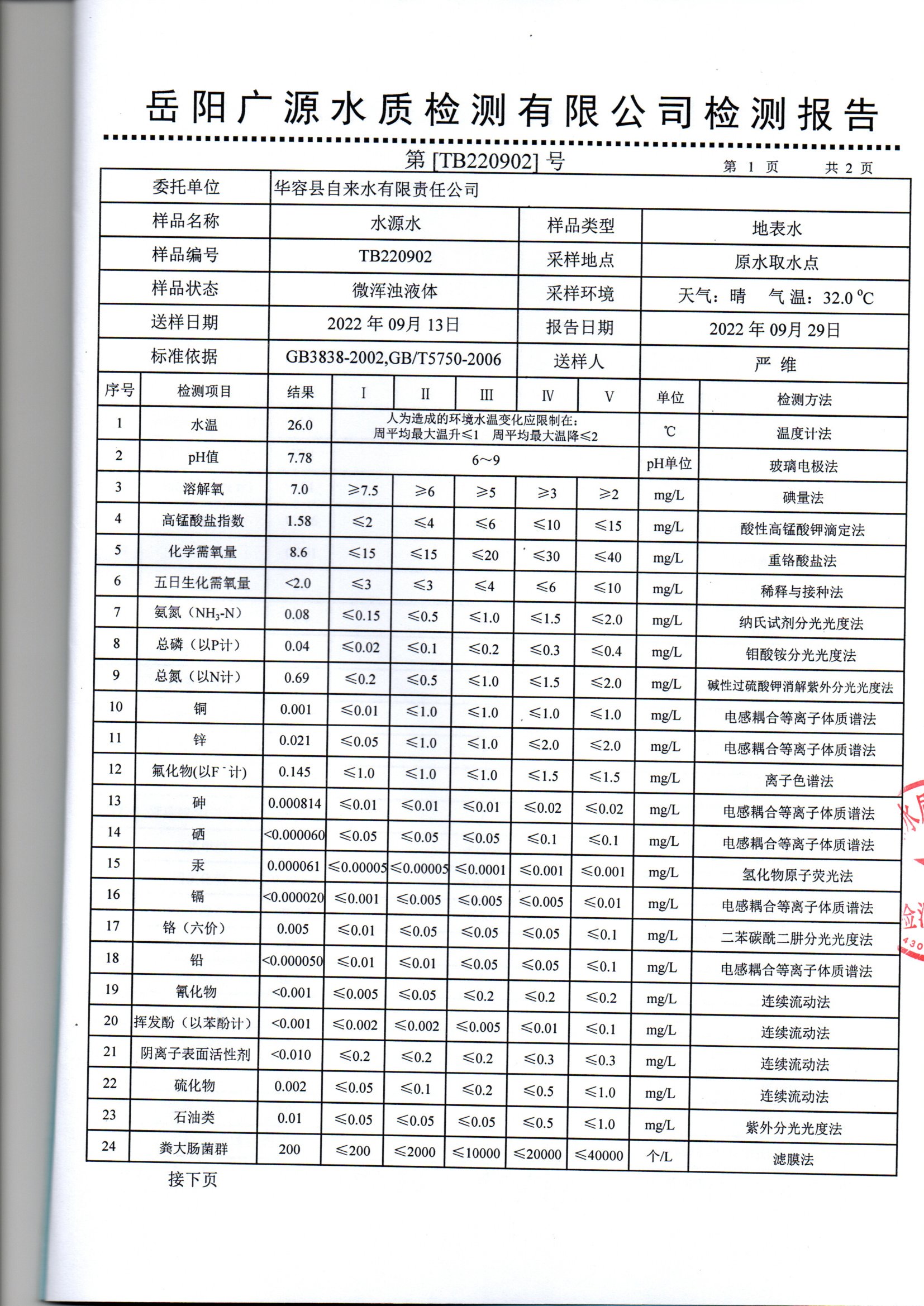 2022年9月水质检测报告(水源水)