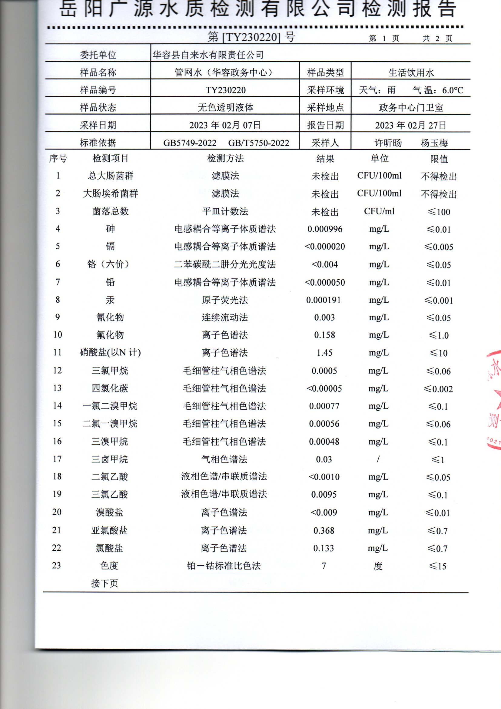 2023年2月水质检测报告(管网水)
