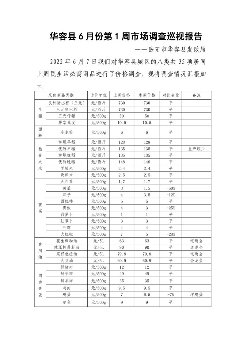 华容县2022年6月份第1周市场调查巡视报告