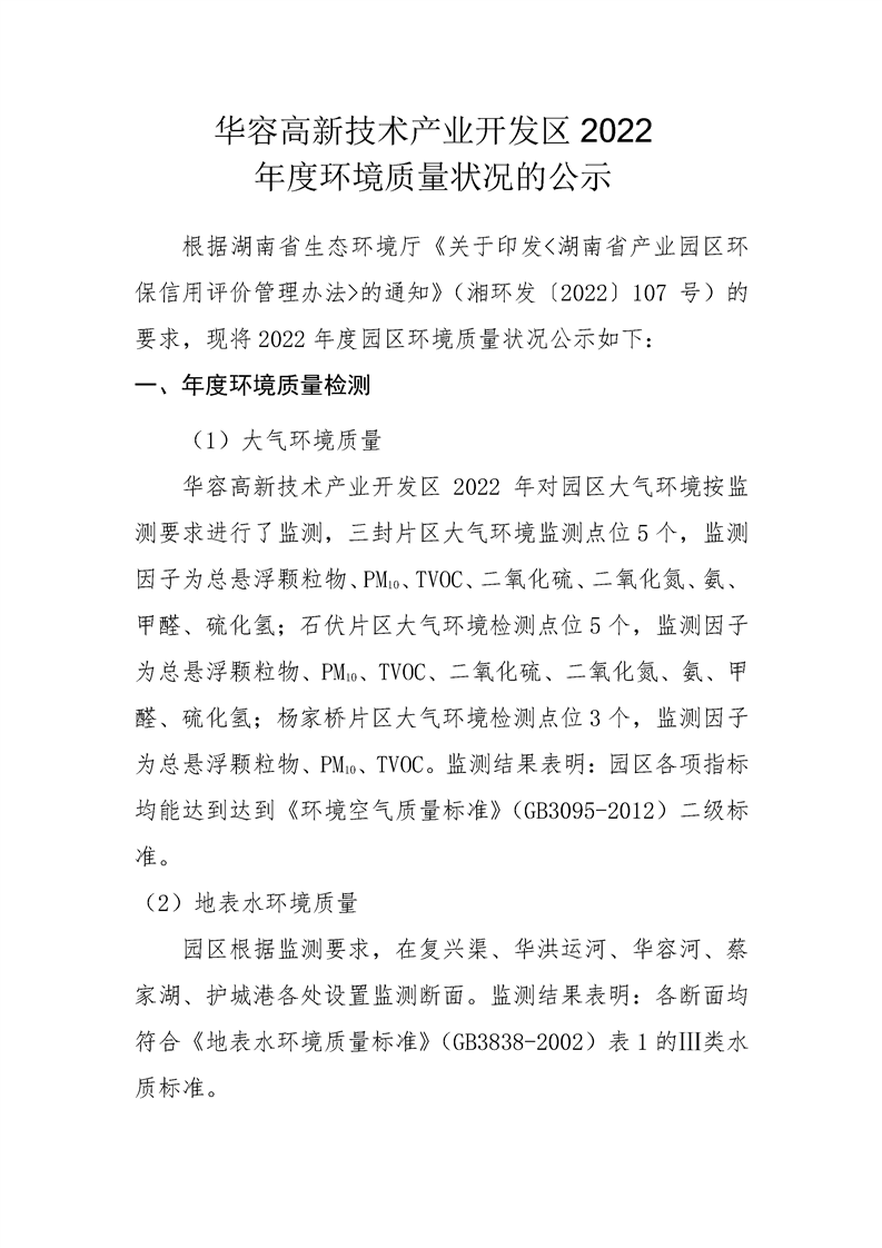 华容高新技术产业开发区2022年度环境质量状况的公示