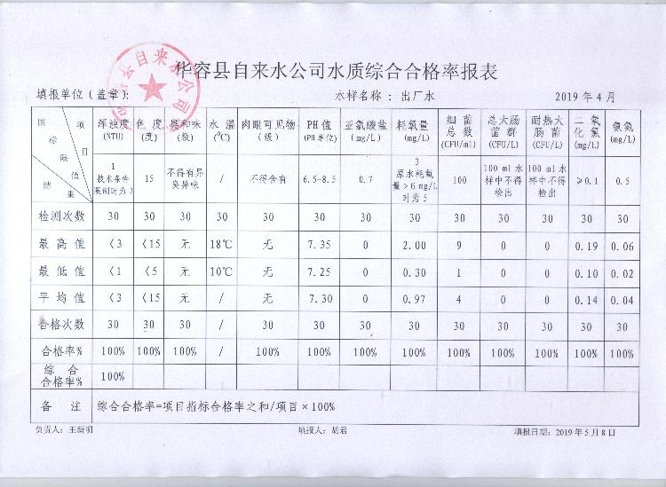 华容县自来水公司2019年4月出厂水水质综合合格率报表