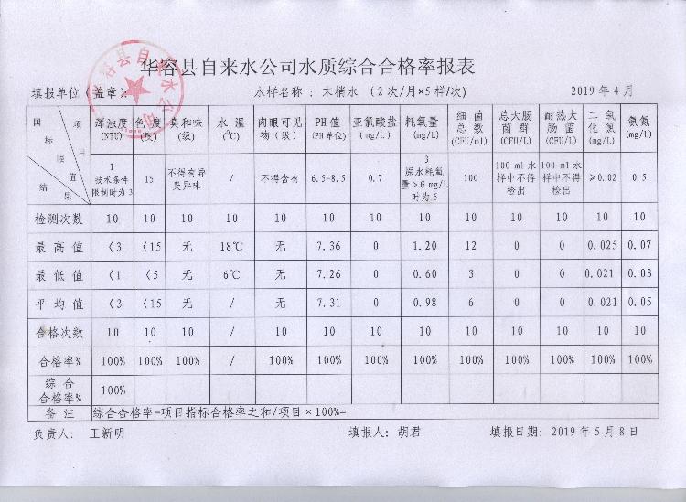 华容县自来水公司2019年4月末梢水水质综合合格率报表