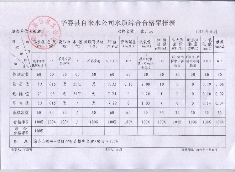 华容县自来水公司2019年6月出厂水水质综合合格率报表