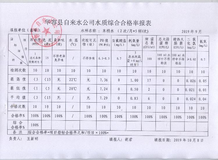 华容县自来水公司2019年9月末梢水水质综合合格率报表