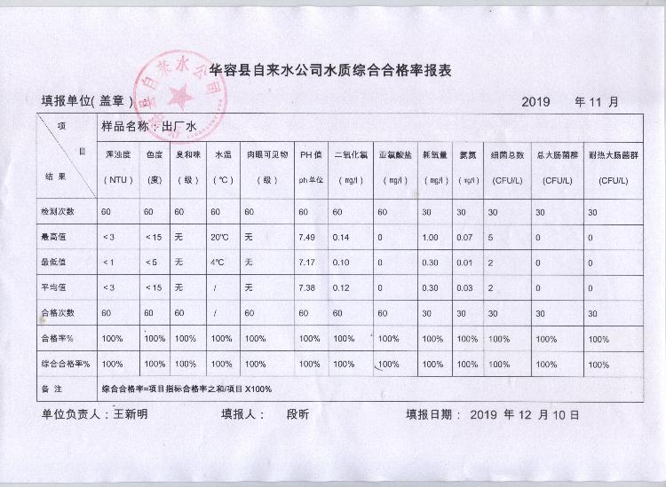 华容县自来水公司2019年11月出厂水水质综合合格率报表