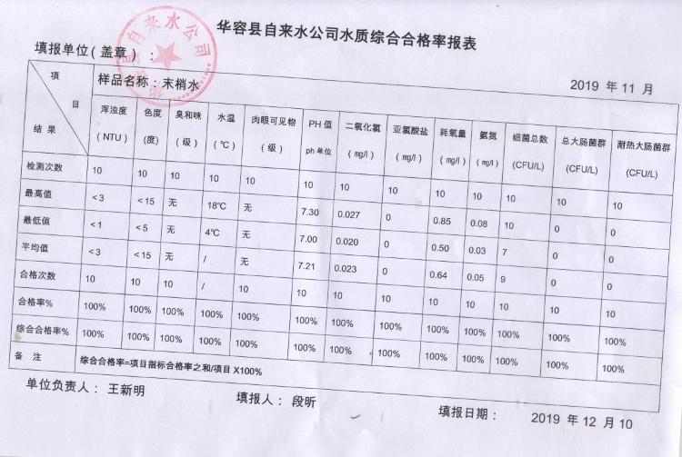 华容县自来水公司2019年11月末梢水水质综合合格率报表