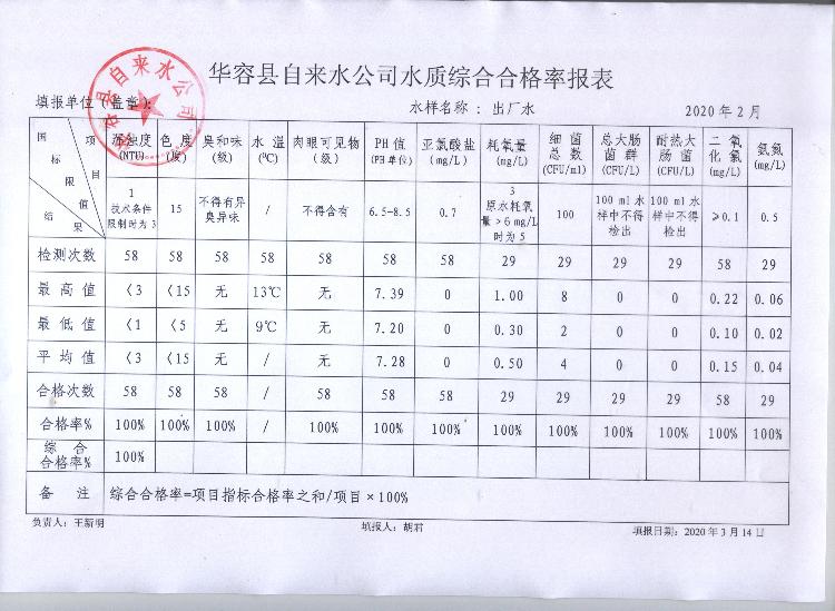 华容县自来水公司2020年2月出厂水水质综合合格率报表