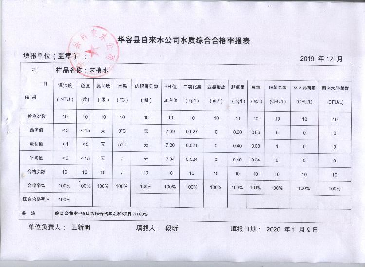 华容县自来水公司2019年12月末梢水水质综合合格率报表