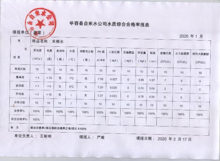 华容县自来水公司2020年1月末梢水水质综合合格率报表