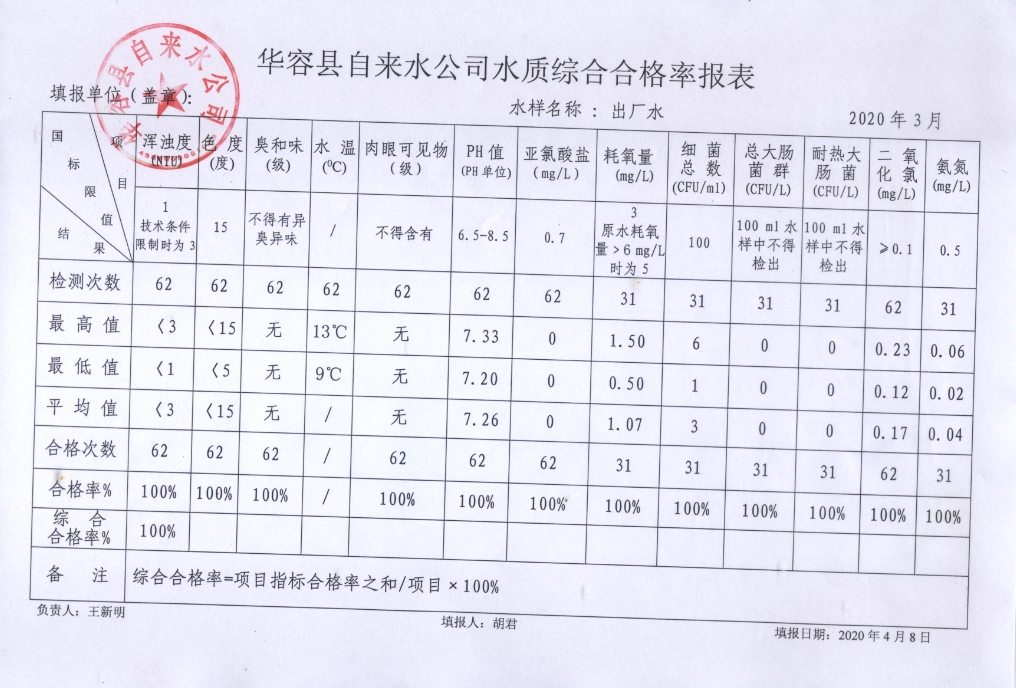 华容县自来水公司2020年3月出厂水水质综合合格率报表